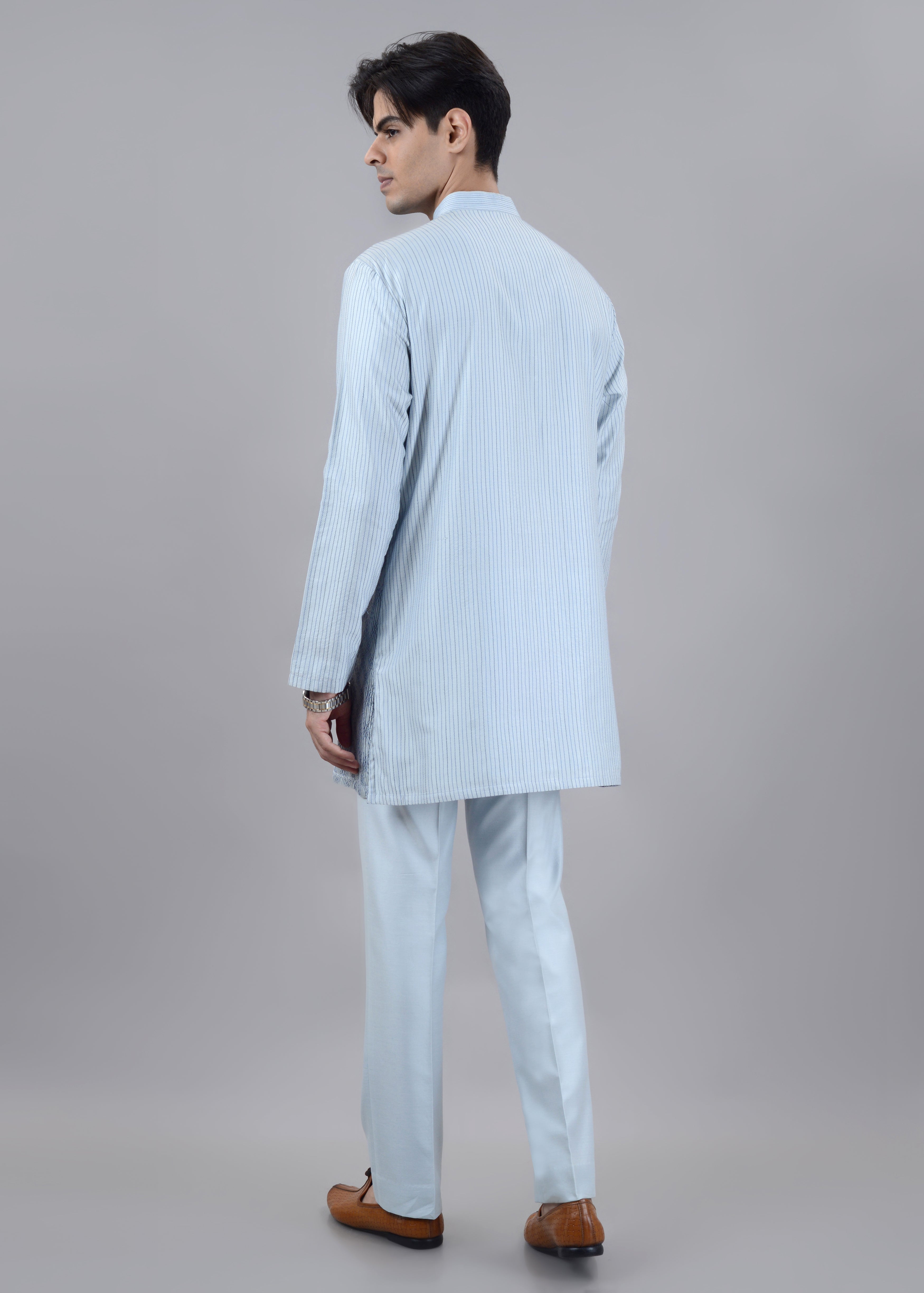 The Blue Reverie Kurta is crafted in a soothing blue shade from a premium solk blend fabric, offering a smooth feel with a subtle sheen. Featuring delicate all-over patterning, a classic mandarin collar, and a clean half placket, it’s perfect for festive and elegant daytime wear.