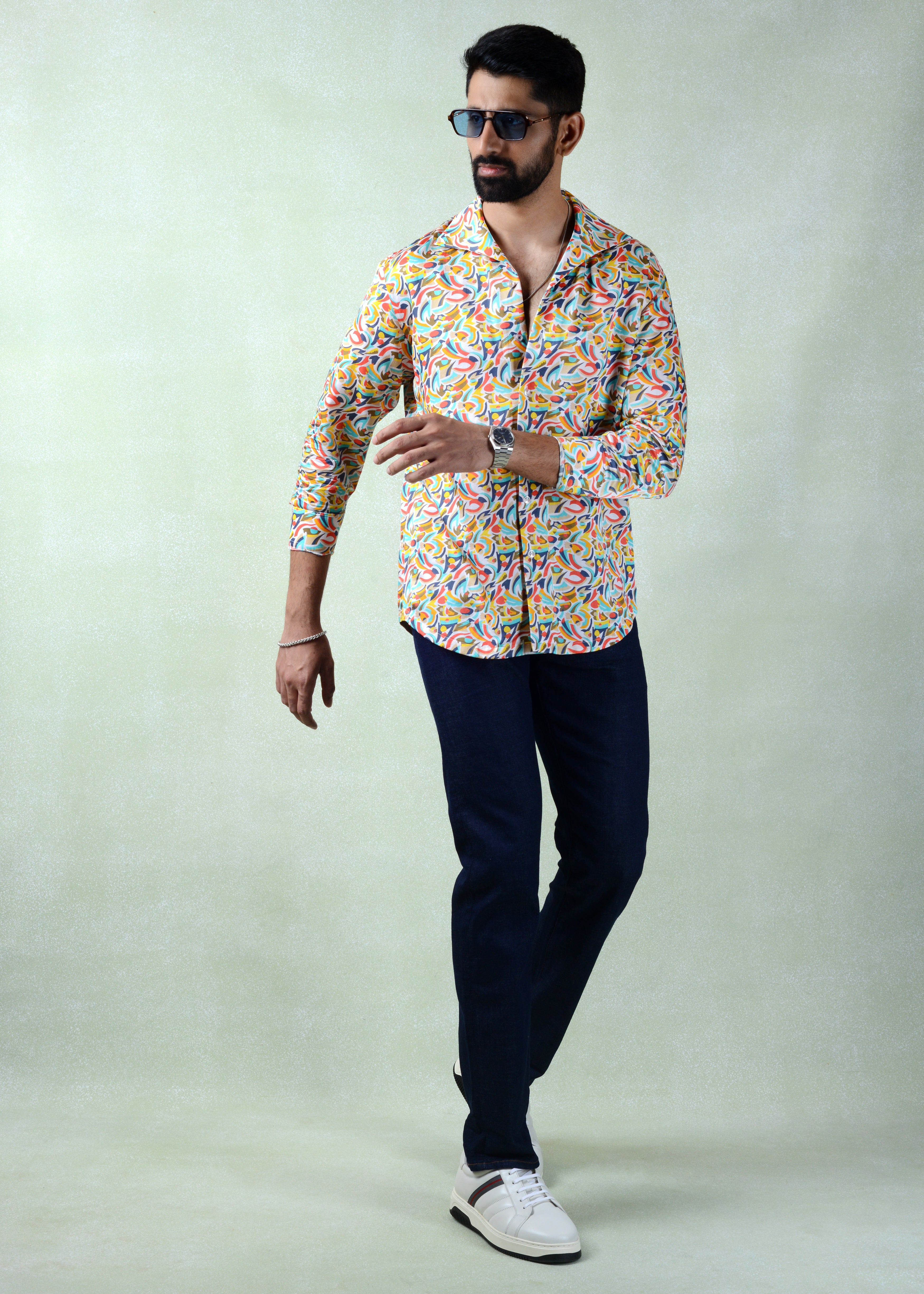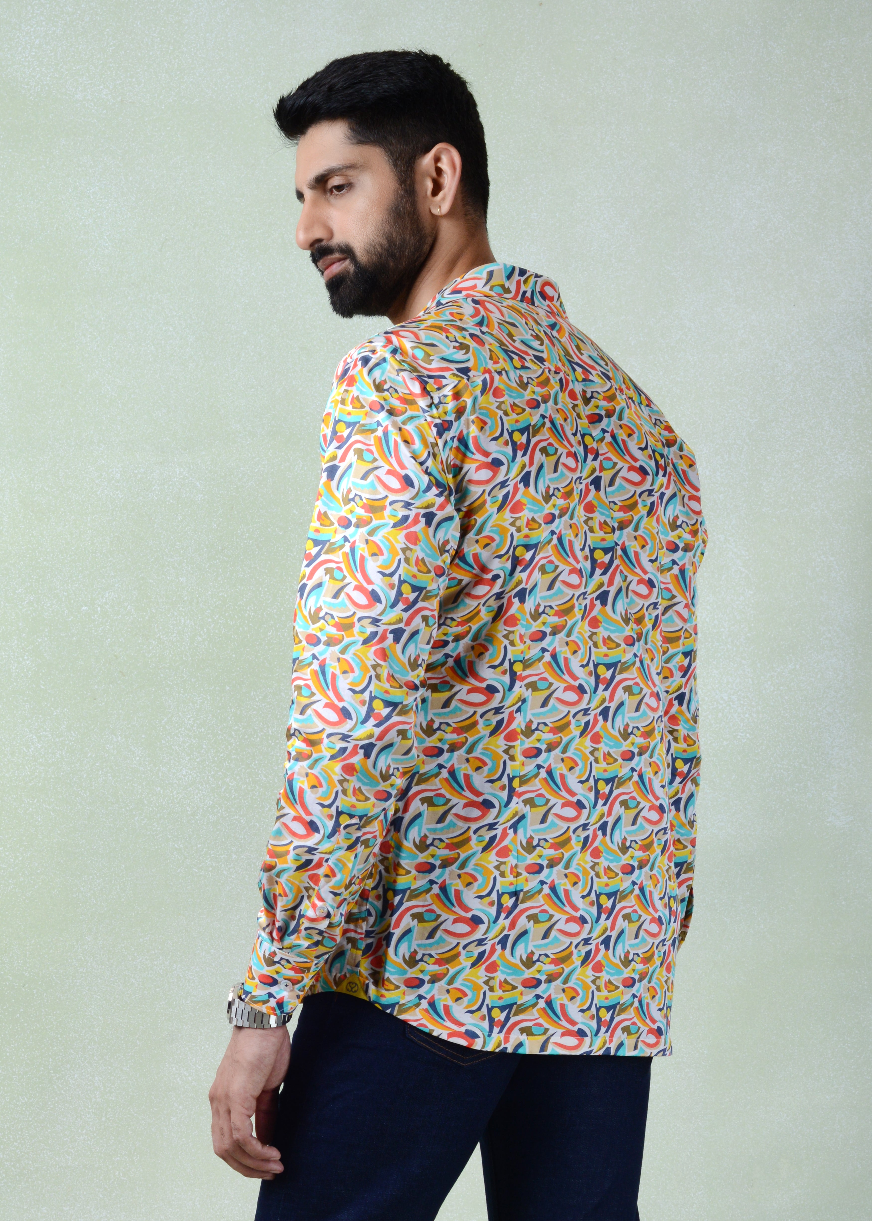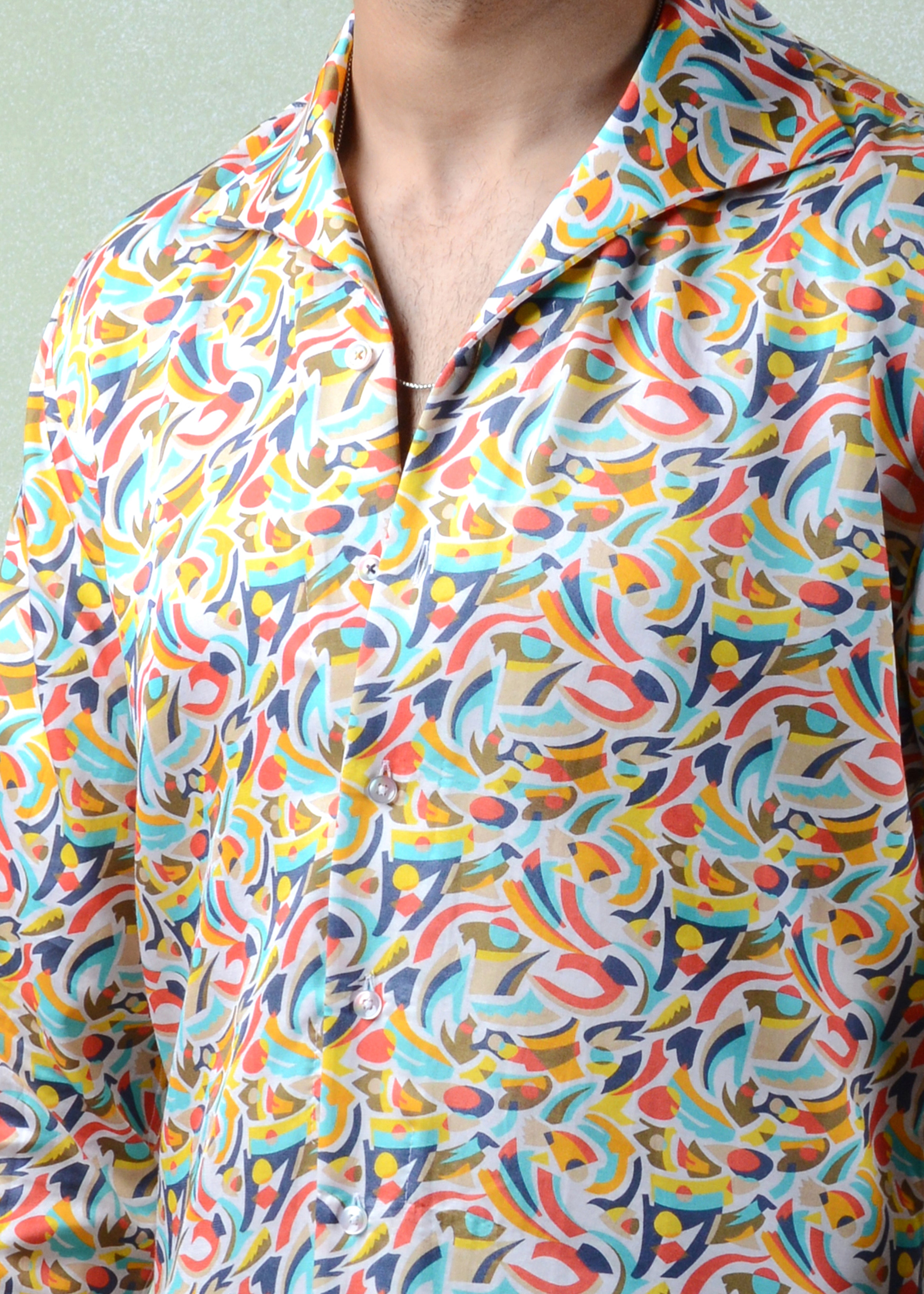 Abstract Multicolour is a vibrant silk shirt designed to make a statement. Featuring an all-over abstract print in a lively multicolour palette, it is styled with a sleek one-piece collar for a clean, contemporary finish. Lightweight and fluid, this shirt offers a refined balance of comfort and bold expression, perfect for elevated casual or occasion wear.