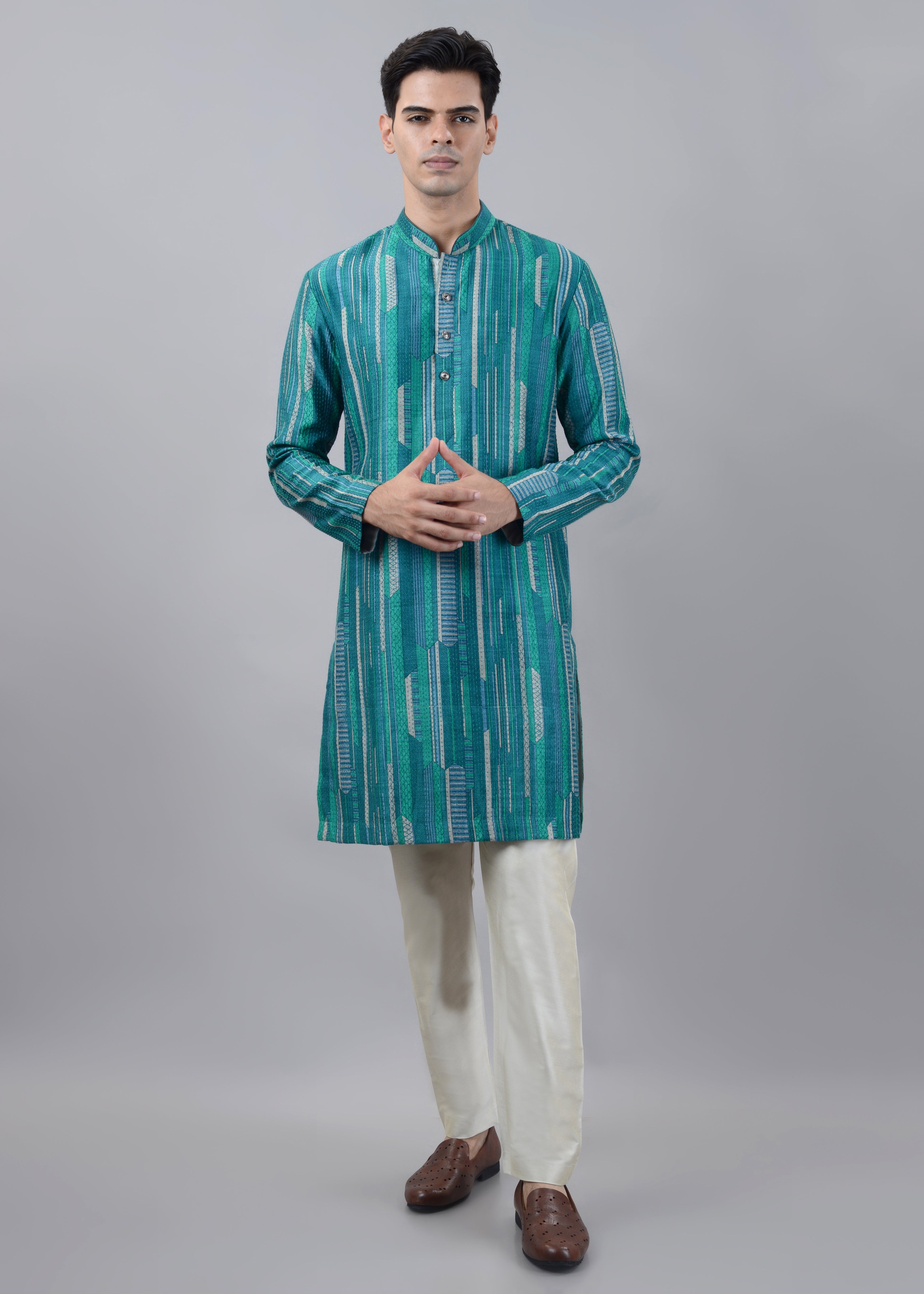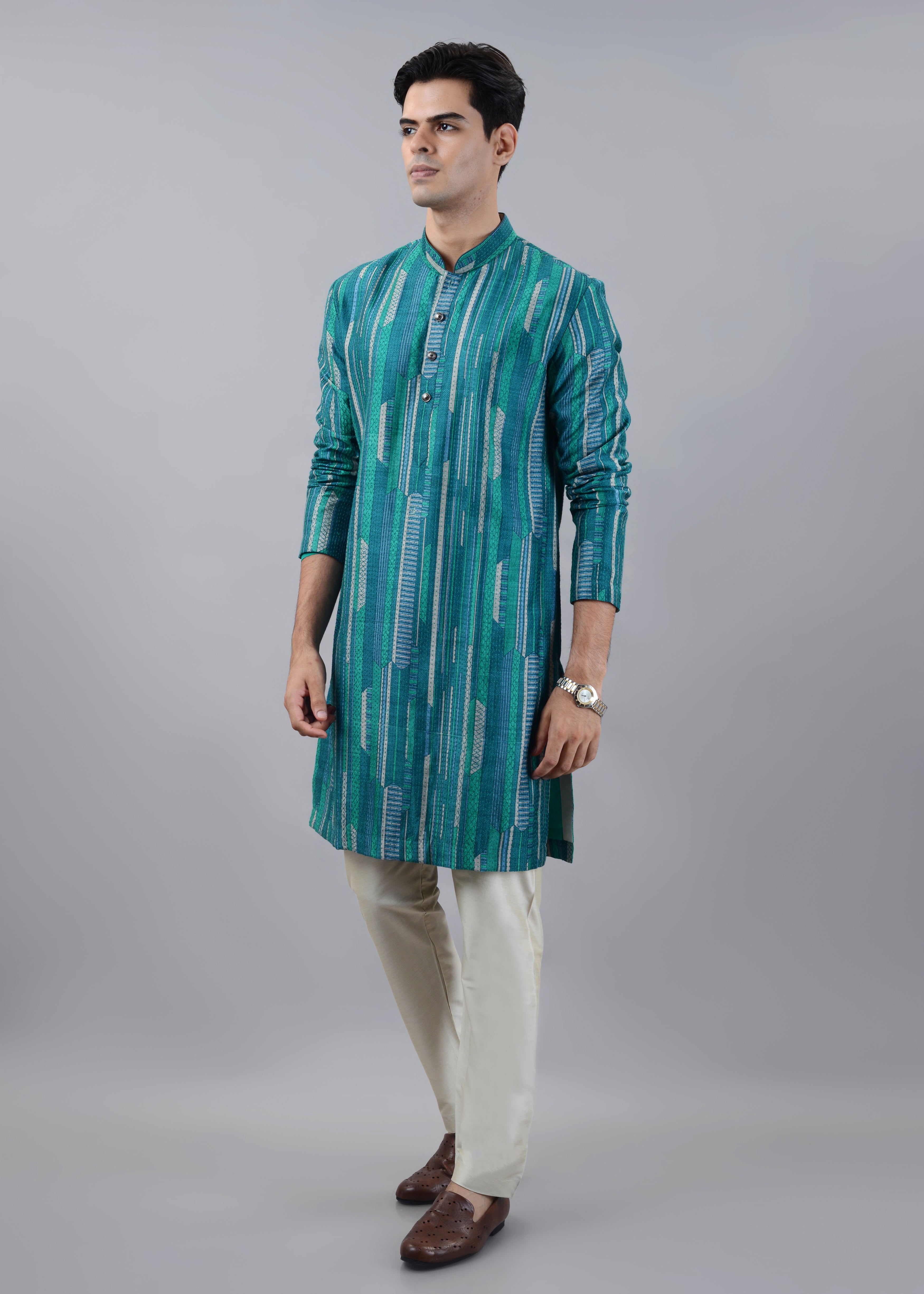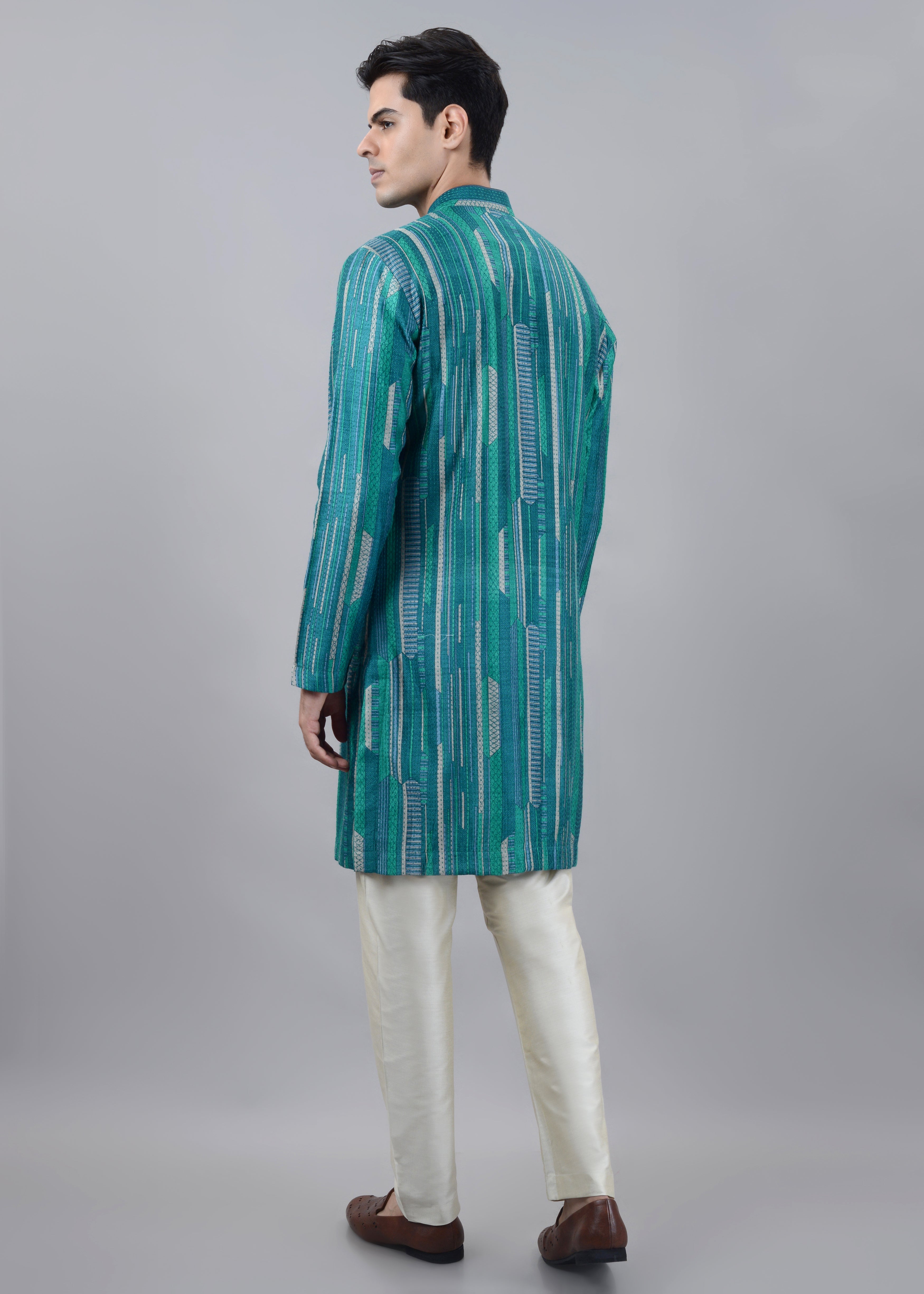 Aqua Green Trace is a blue-green silk kurta set highlighted with fine kantha embroidery and abstract linear detailing. Designed with a mandarin collar and a sleek silhouette, it delivers an elegant, contemporary look perfect for festive and refined occasions.