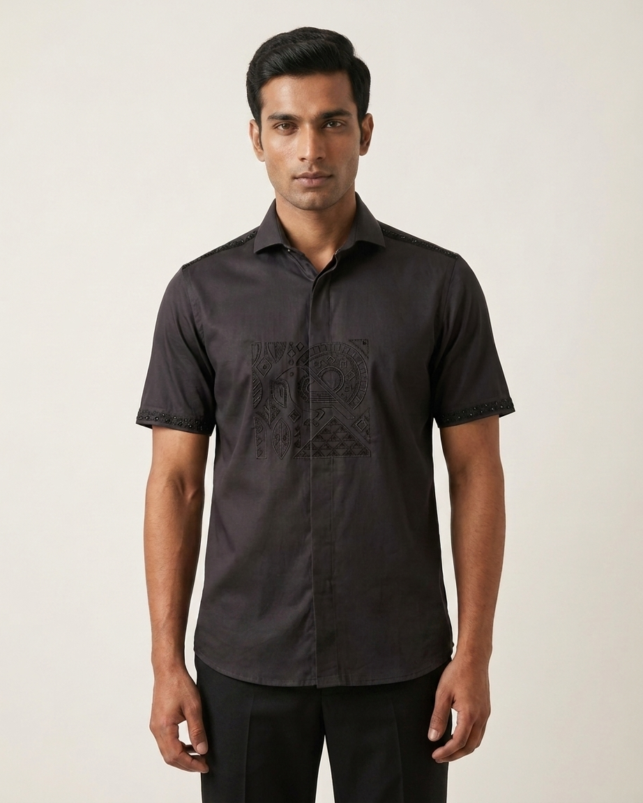 Black Vintage Shirt — This black half-sleeve shirt crafted in premium fabric for a sleek and comfortable fit. Featuring intricate tonal detailing on the front, it brings a subtle vintage-inspired character to a modern silhouette. Finished with clean tailoring and refined accents on the sleeves, it’s ideal for evening wear and elevated casual styling.