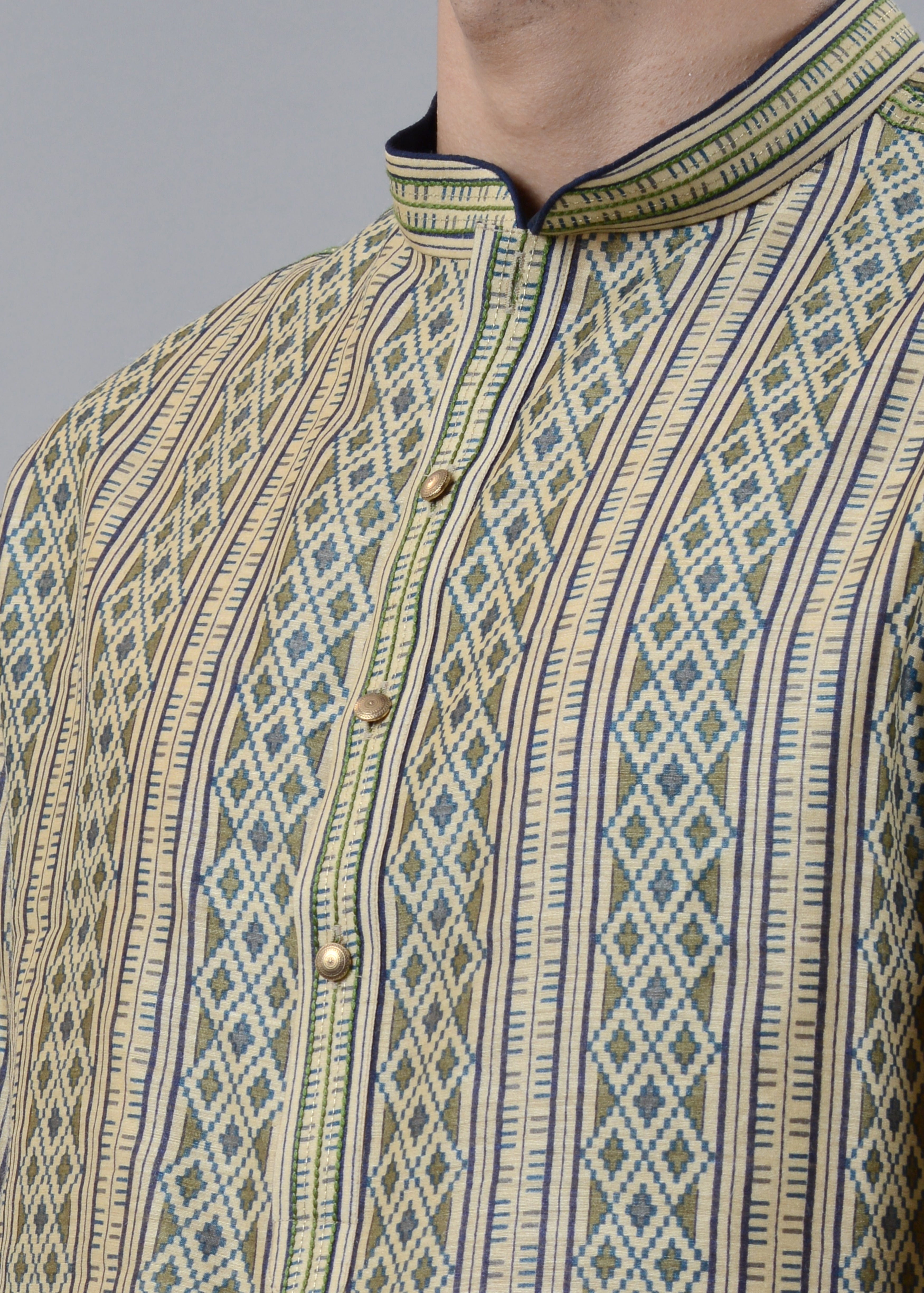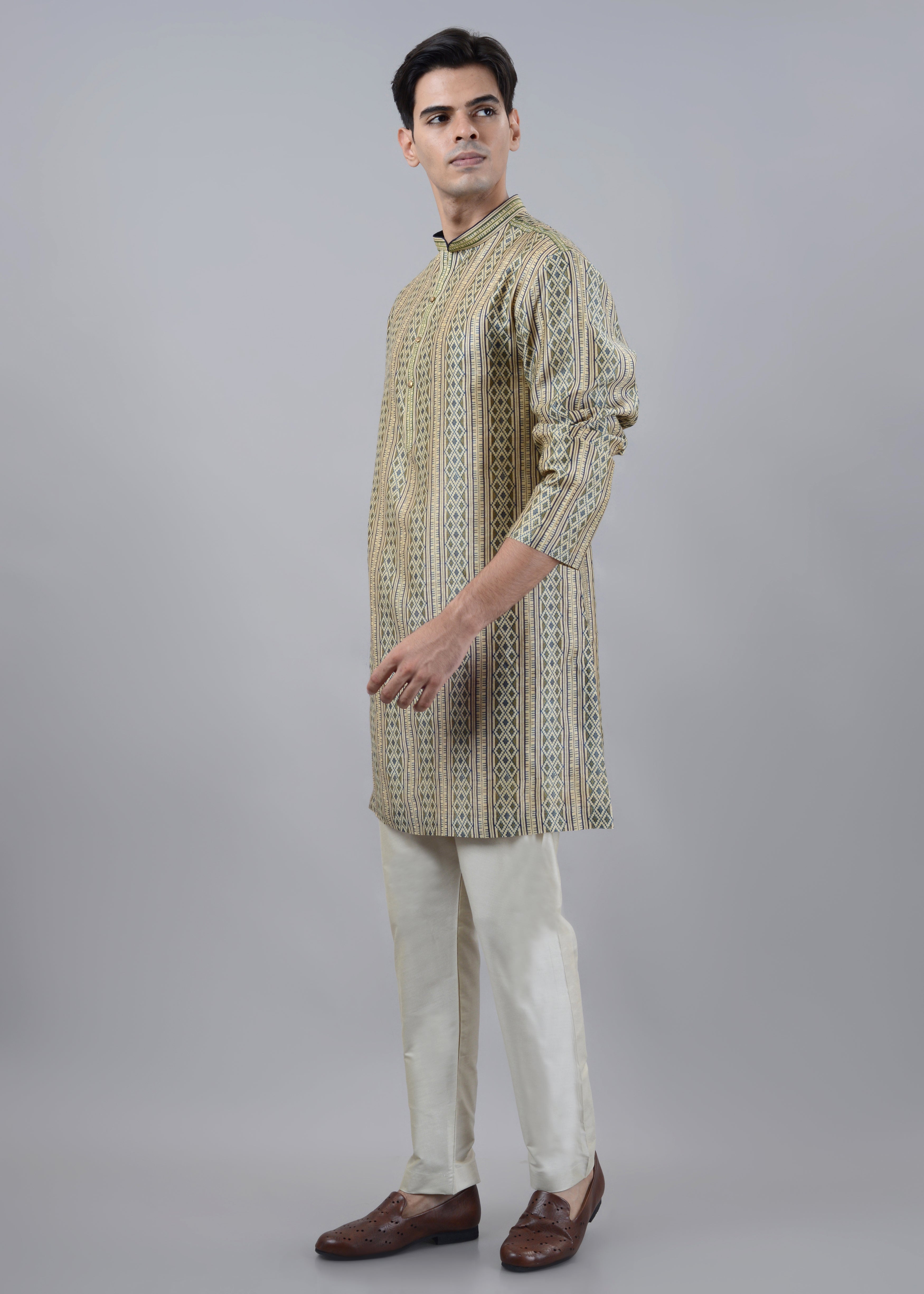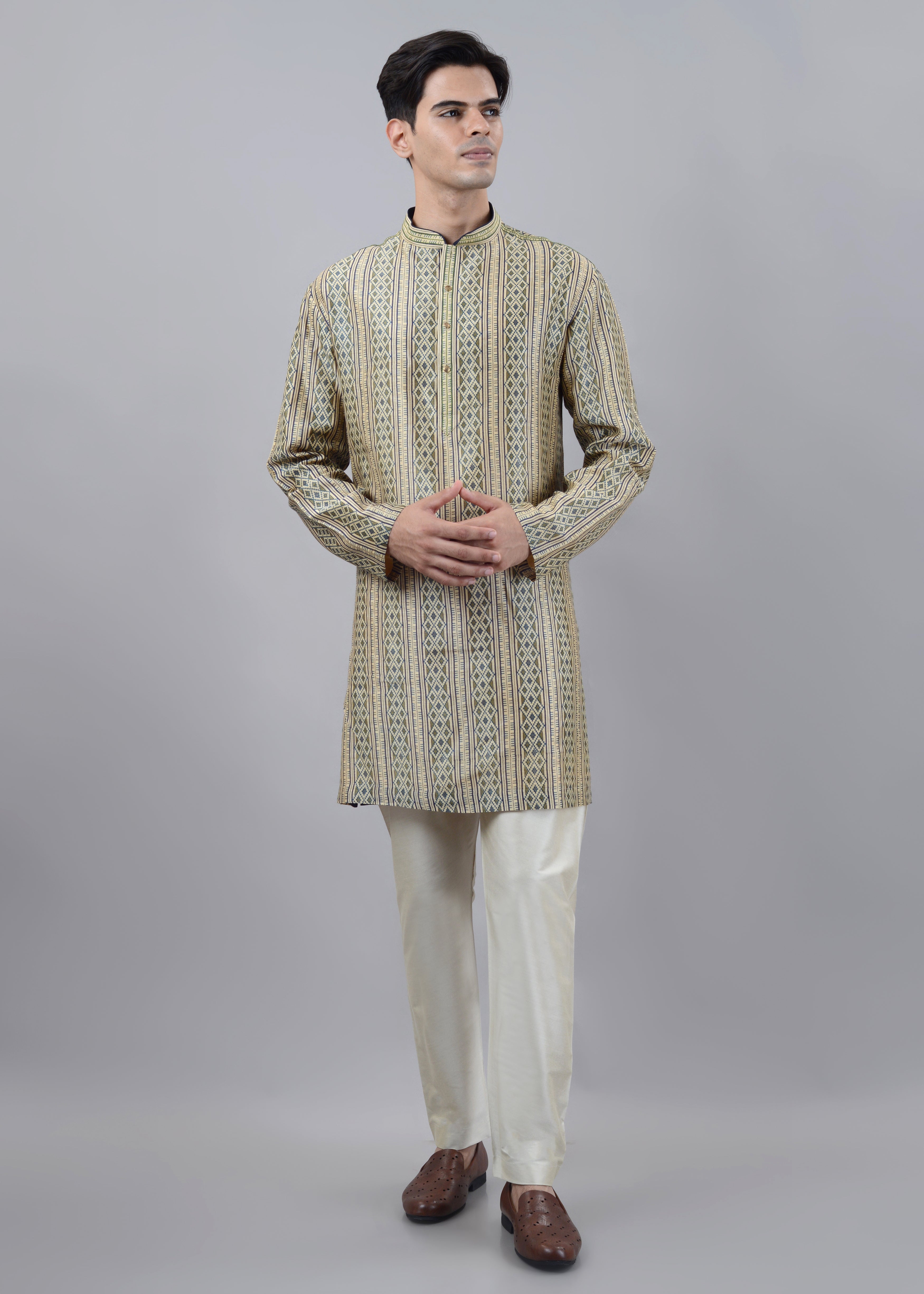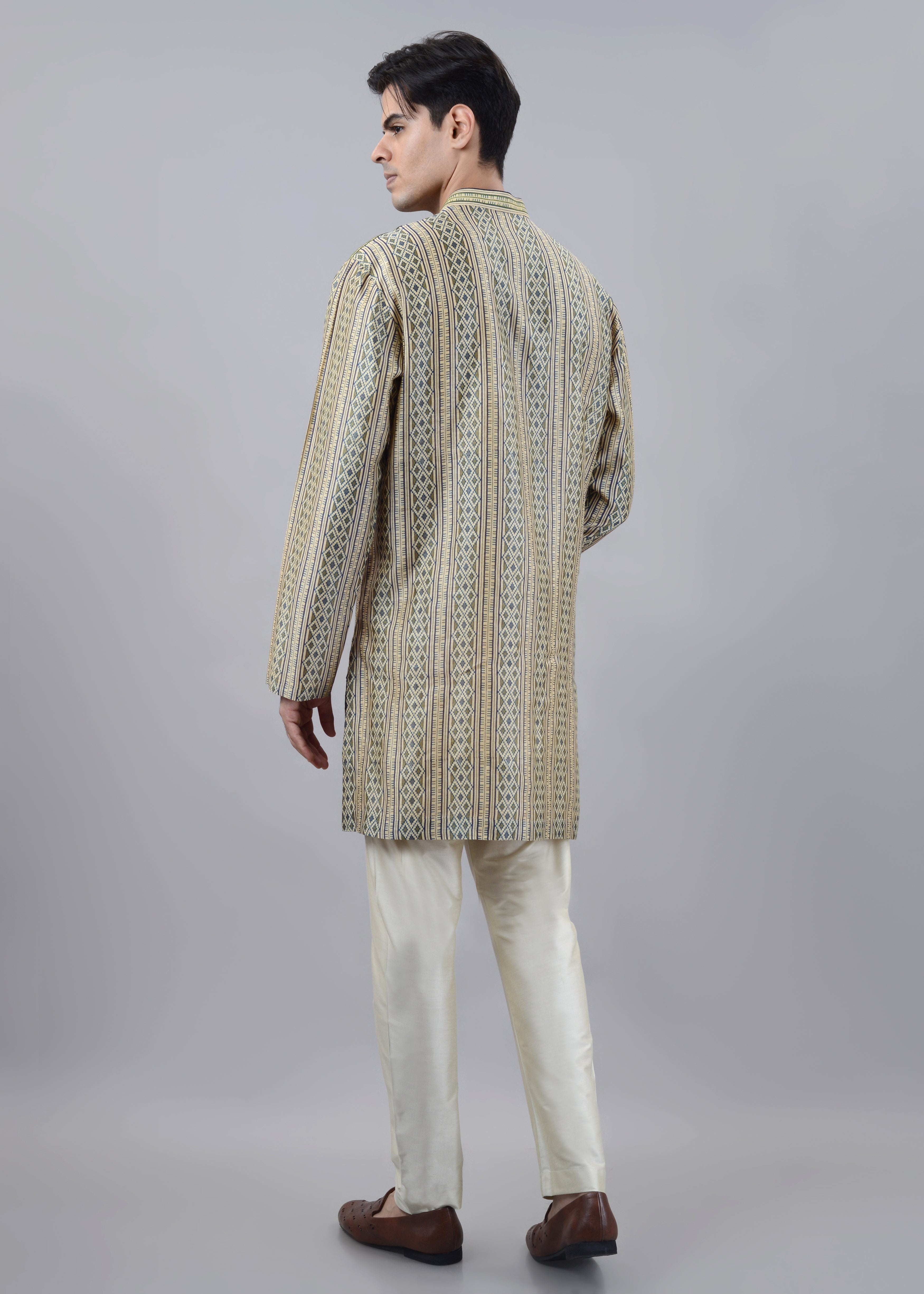 Blue Grass Gridlock is a silk kurta set in a refined blue grass hue, featuring a structured geometric grid pattern with vertical detailing. Finished with a mandarin collar and buttoned placket, it offers a polished and elegant look ideal for festive and formal occasions.