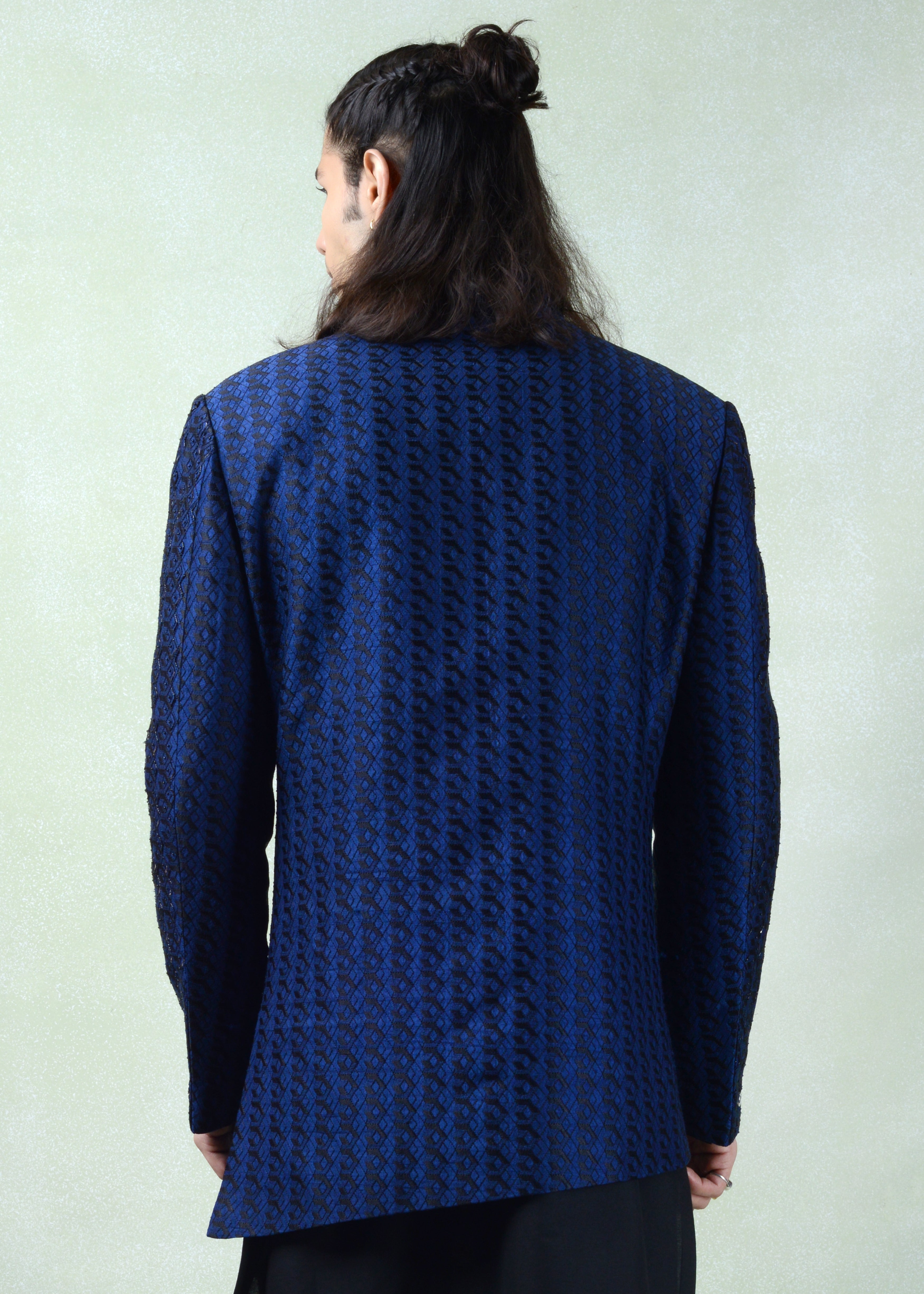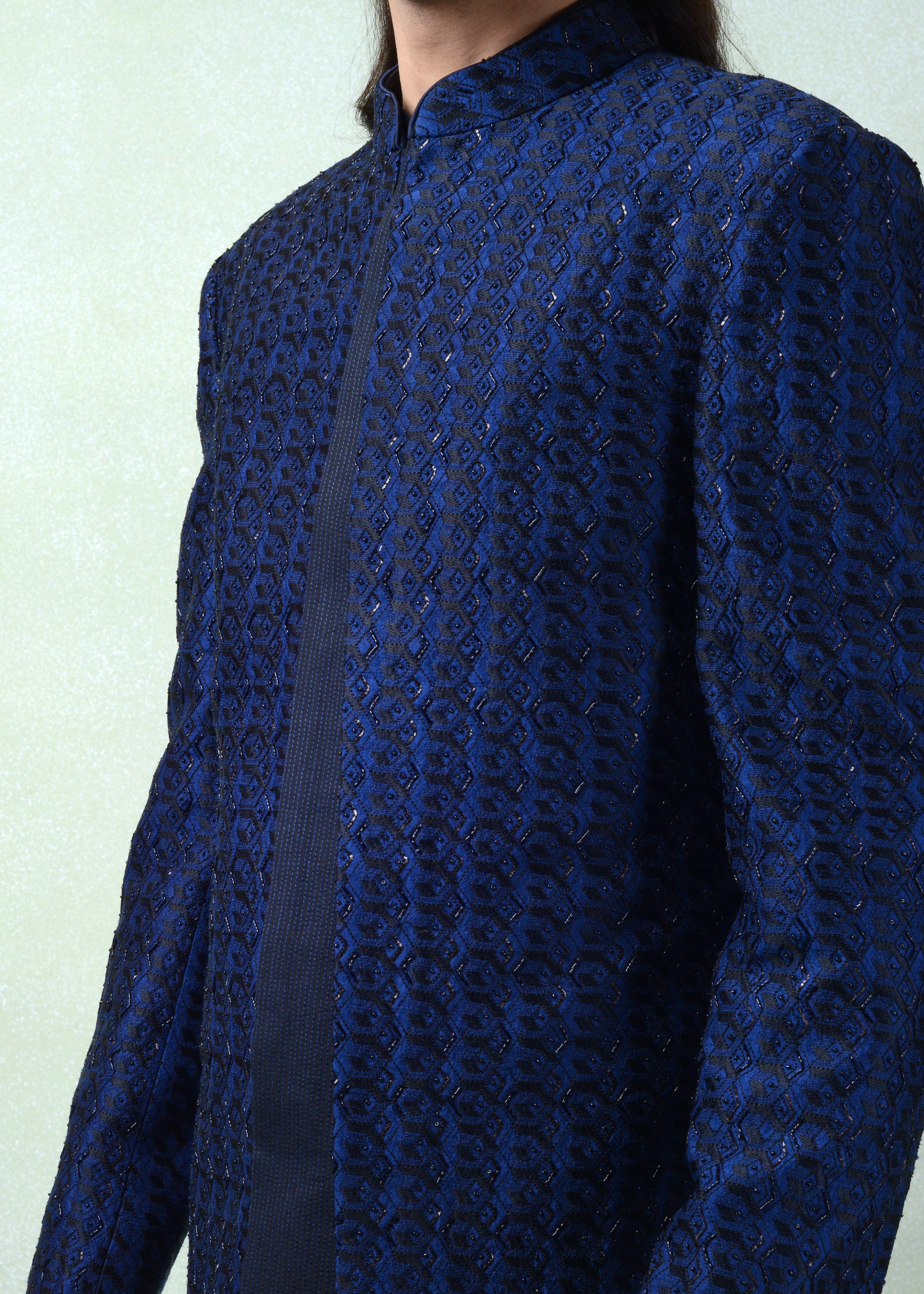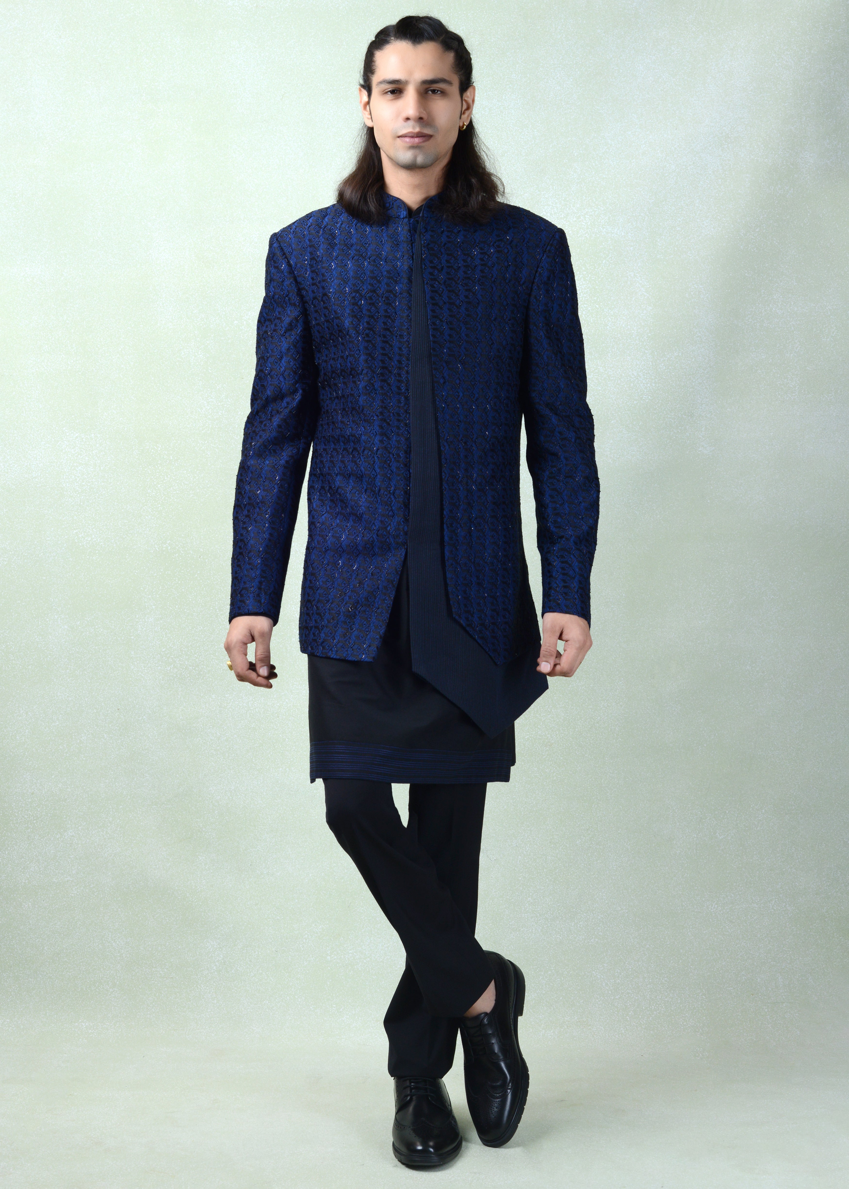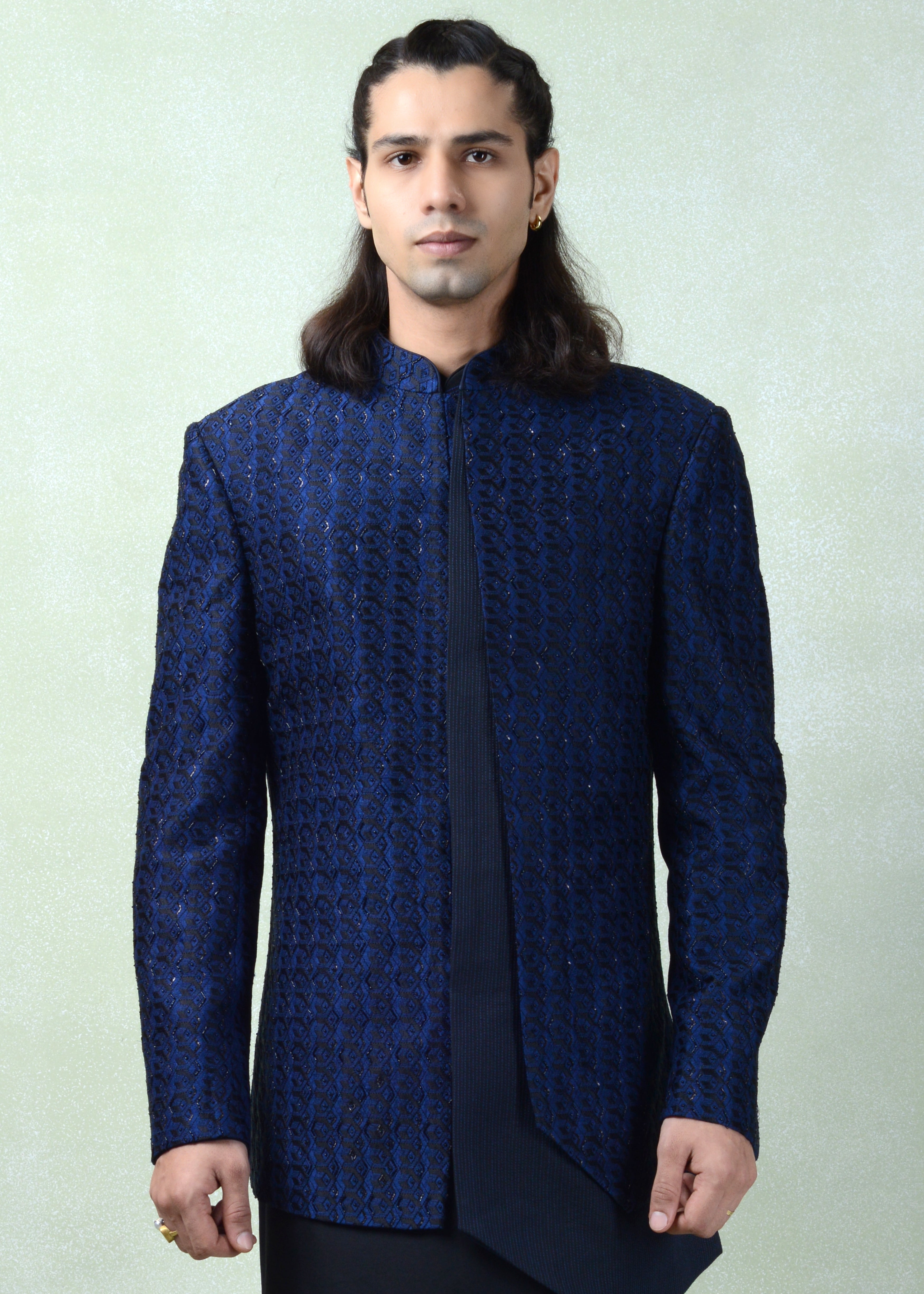 Cubic Glitz Navy Blue is an elegant Jodhpuri crafted in rich raw silk, featuring a deep navy blue hue with a subtle geometric textured finish. Designed with a structured silhouette and a refined band collar, it offers a perfect blend of traditional craftsmanship and contemporary sophistication, making it ideal for festive occasions and formal celebrations