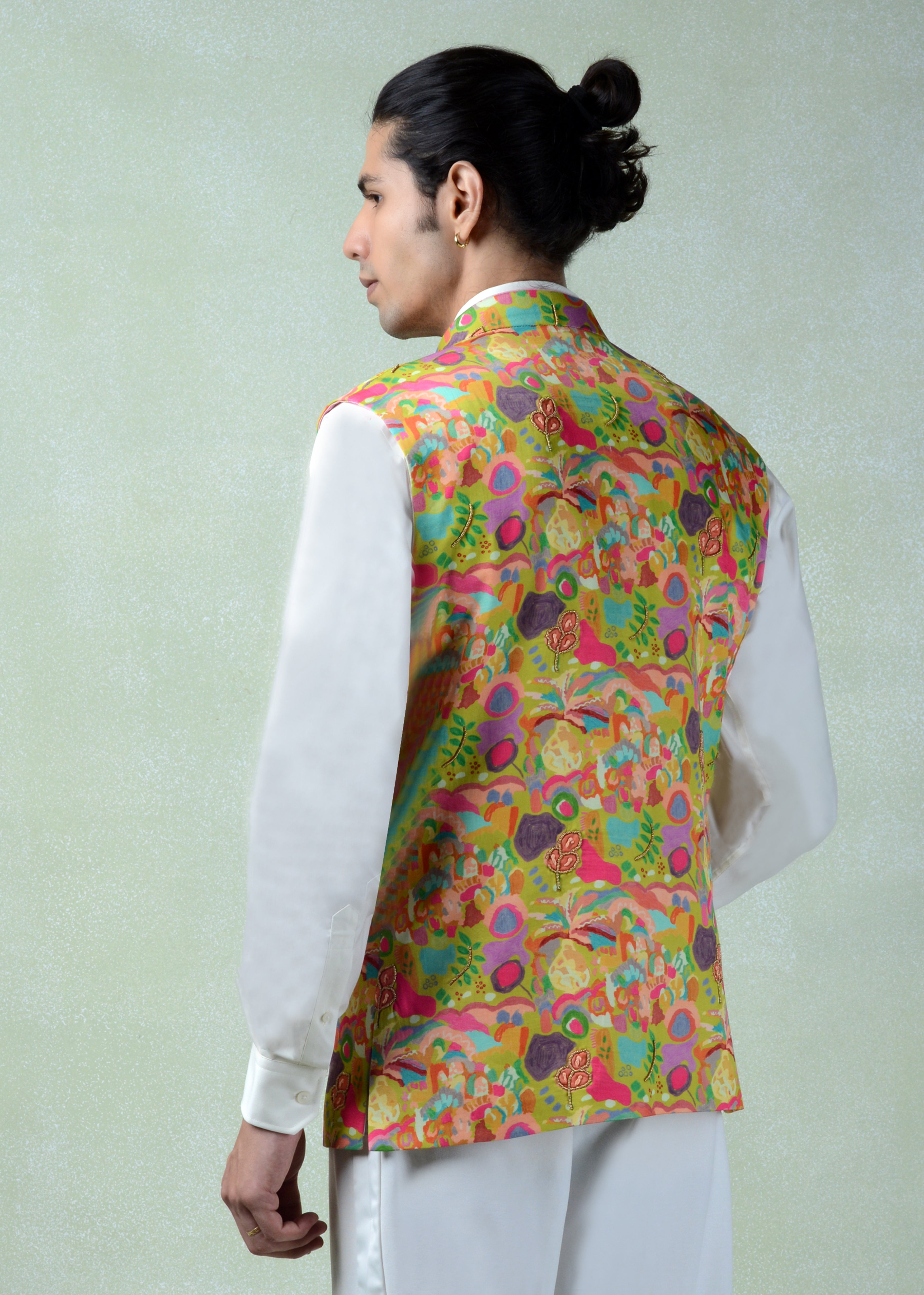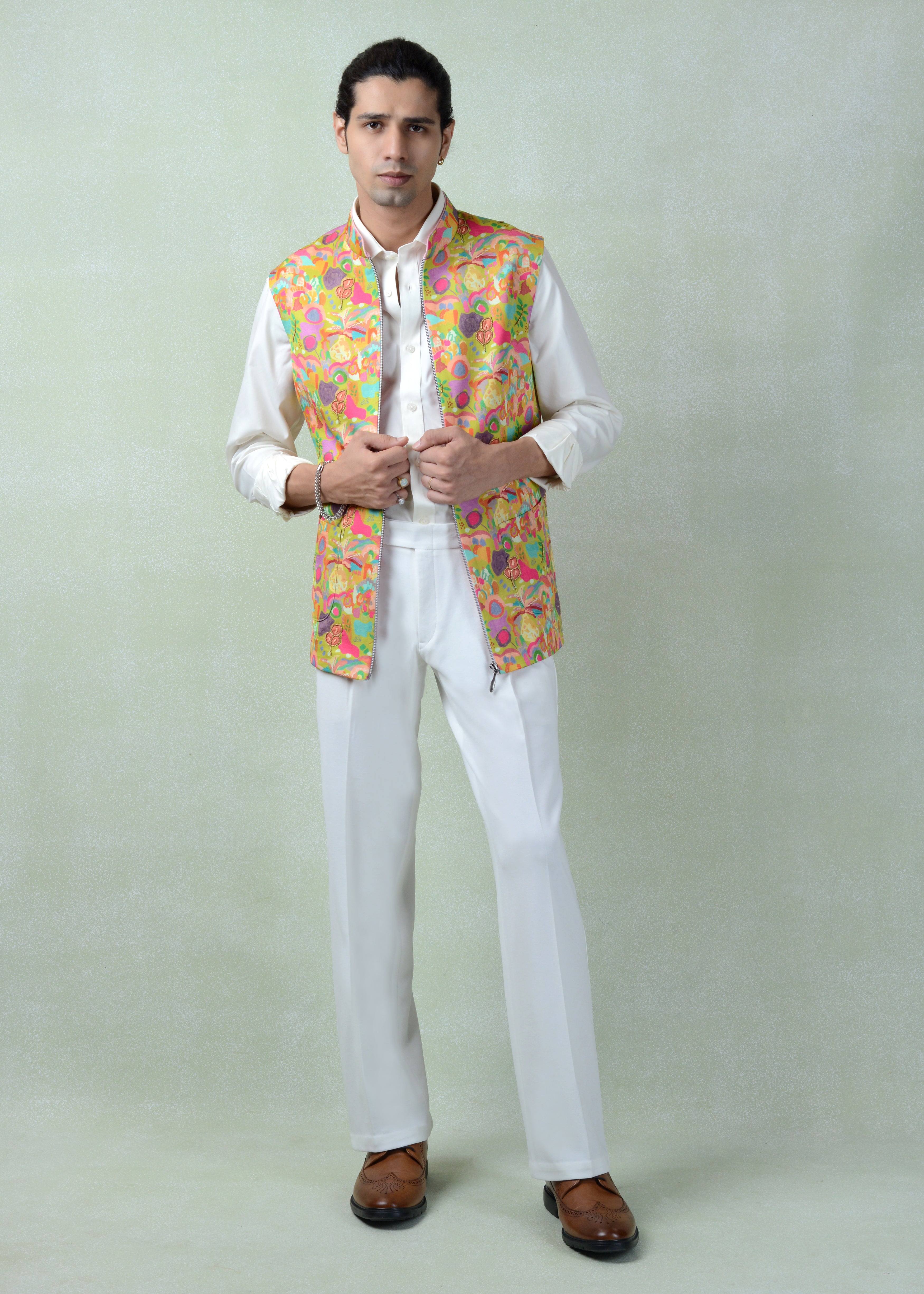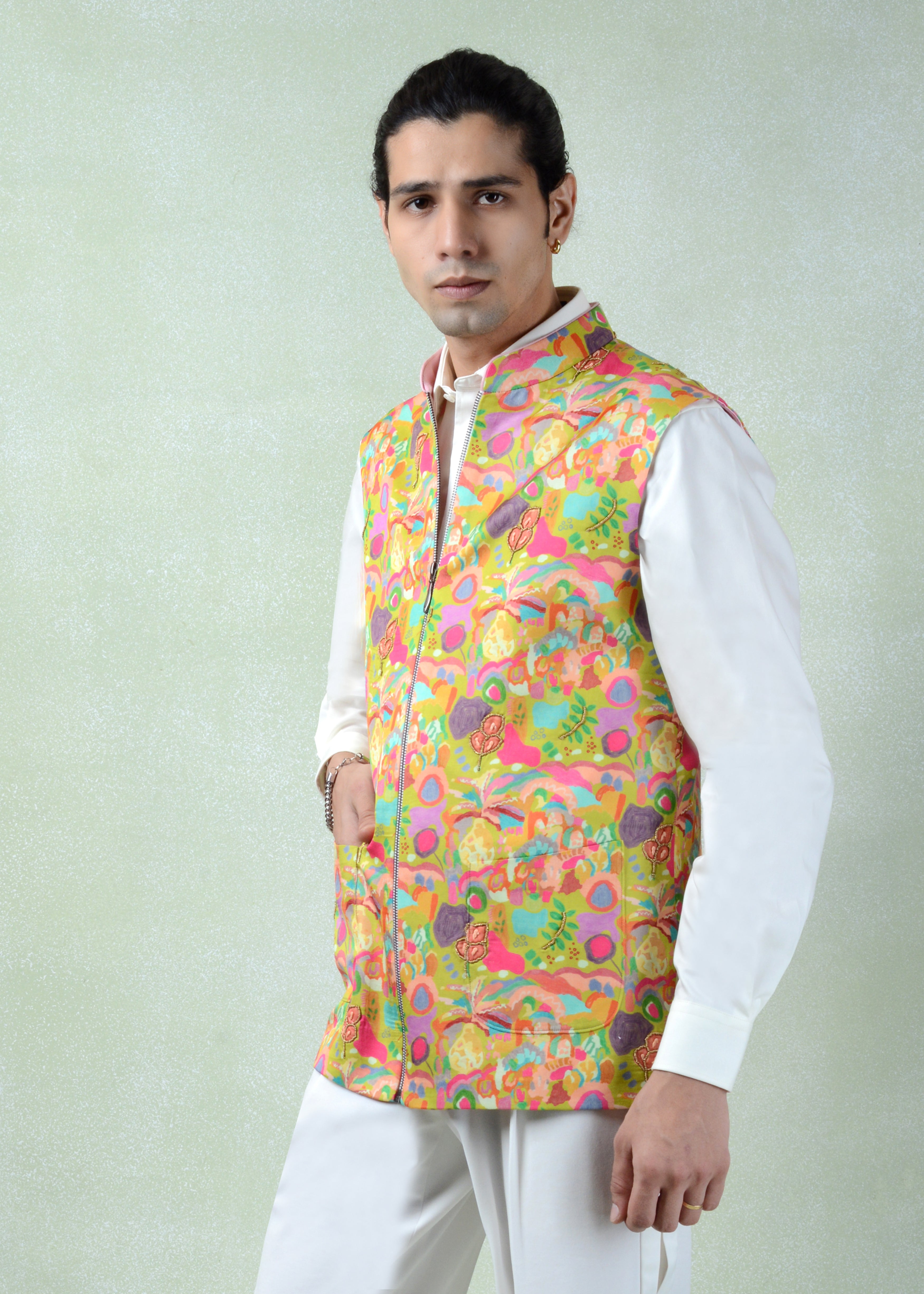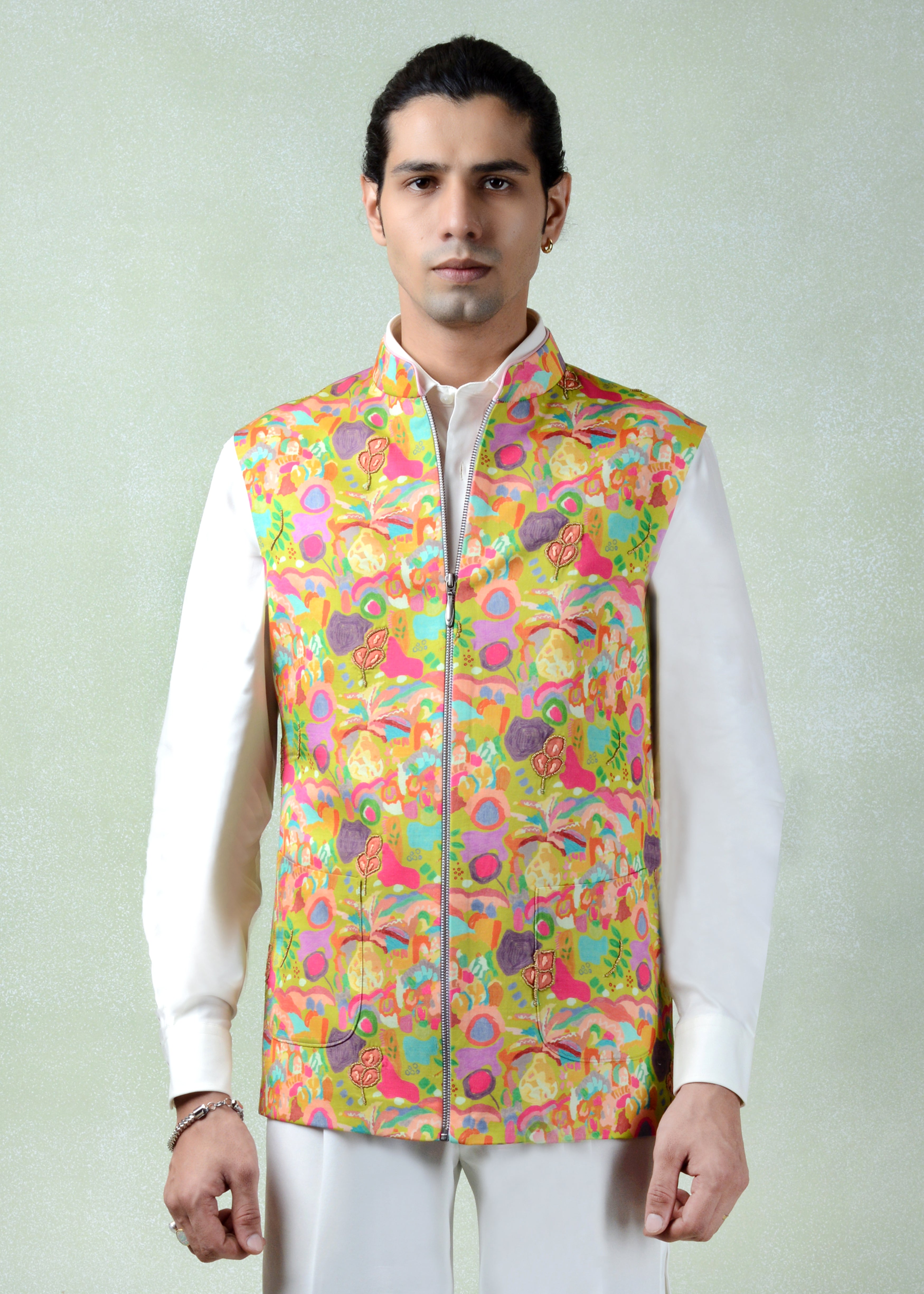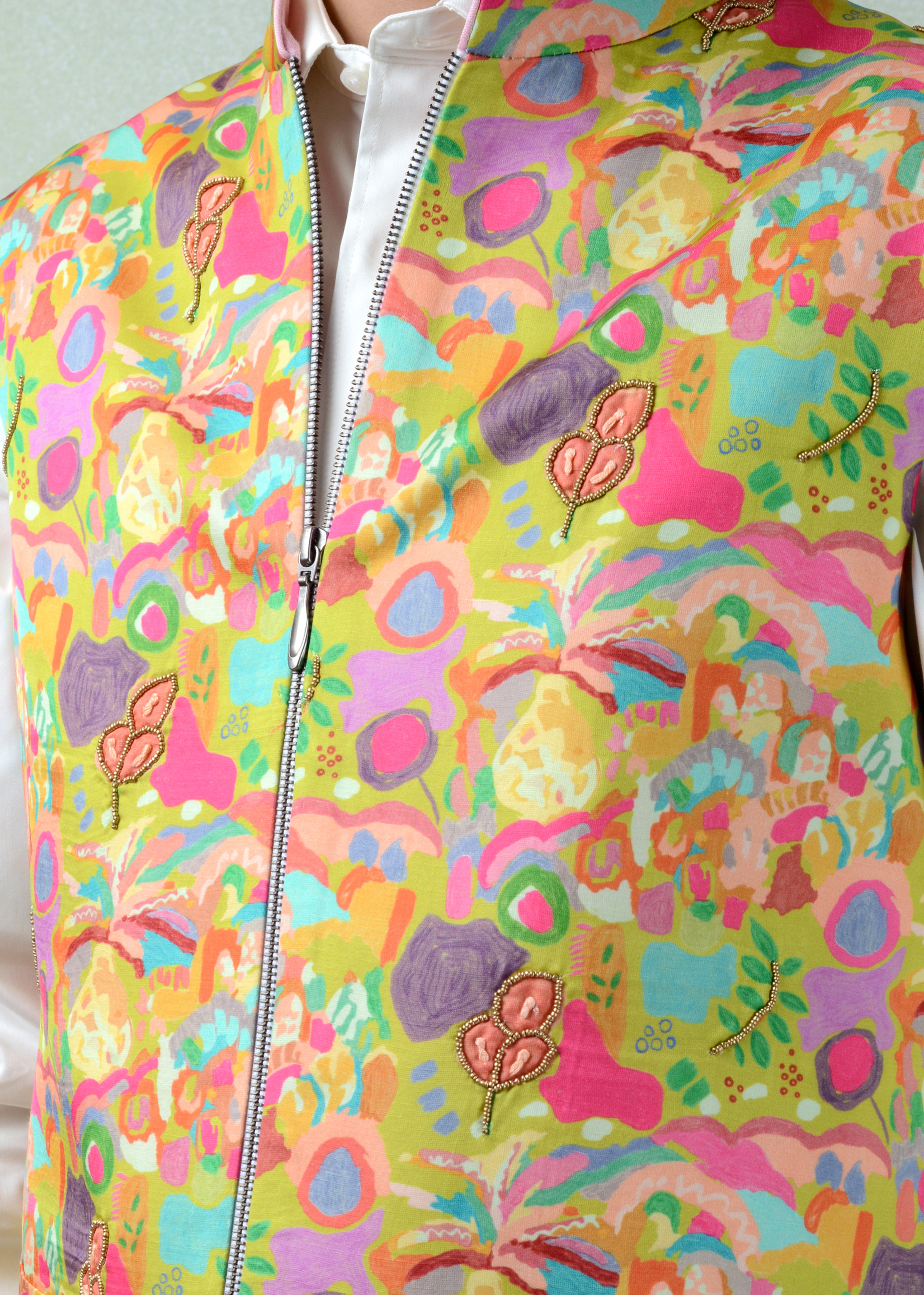 Whimsy Dreams is a vibrant multicolour silk koti that celebrates playful artistry and craftsmanship. Featuring an all-over abstract print, it is elevated with delicate hand embroidery motifs that add texture and charm. Designed with a front zip closure and a sleek silhouette, this statement piece brings a joyful yet refined touch to contemporary styling.