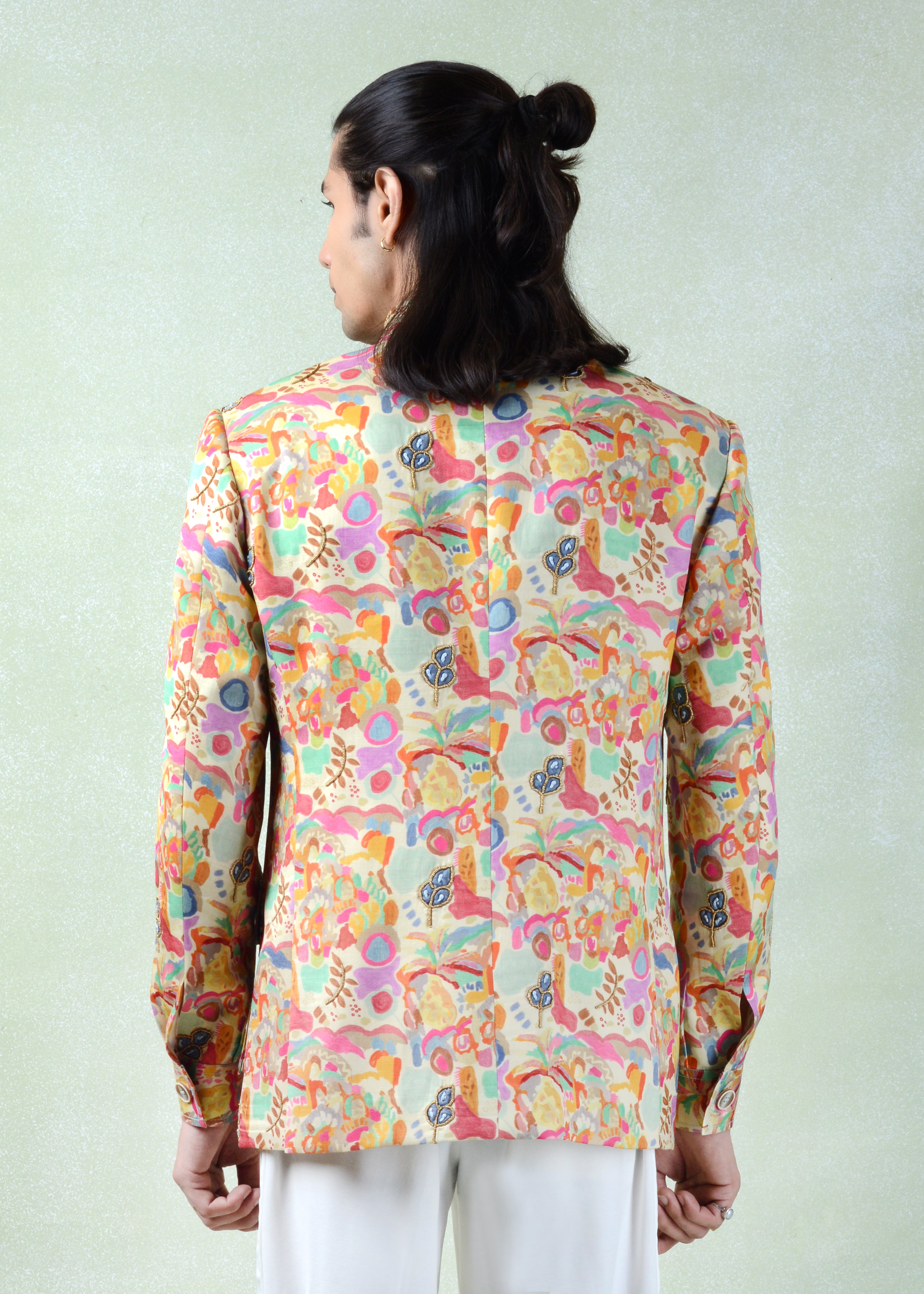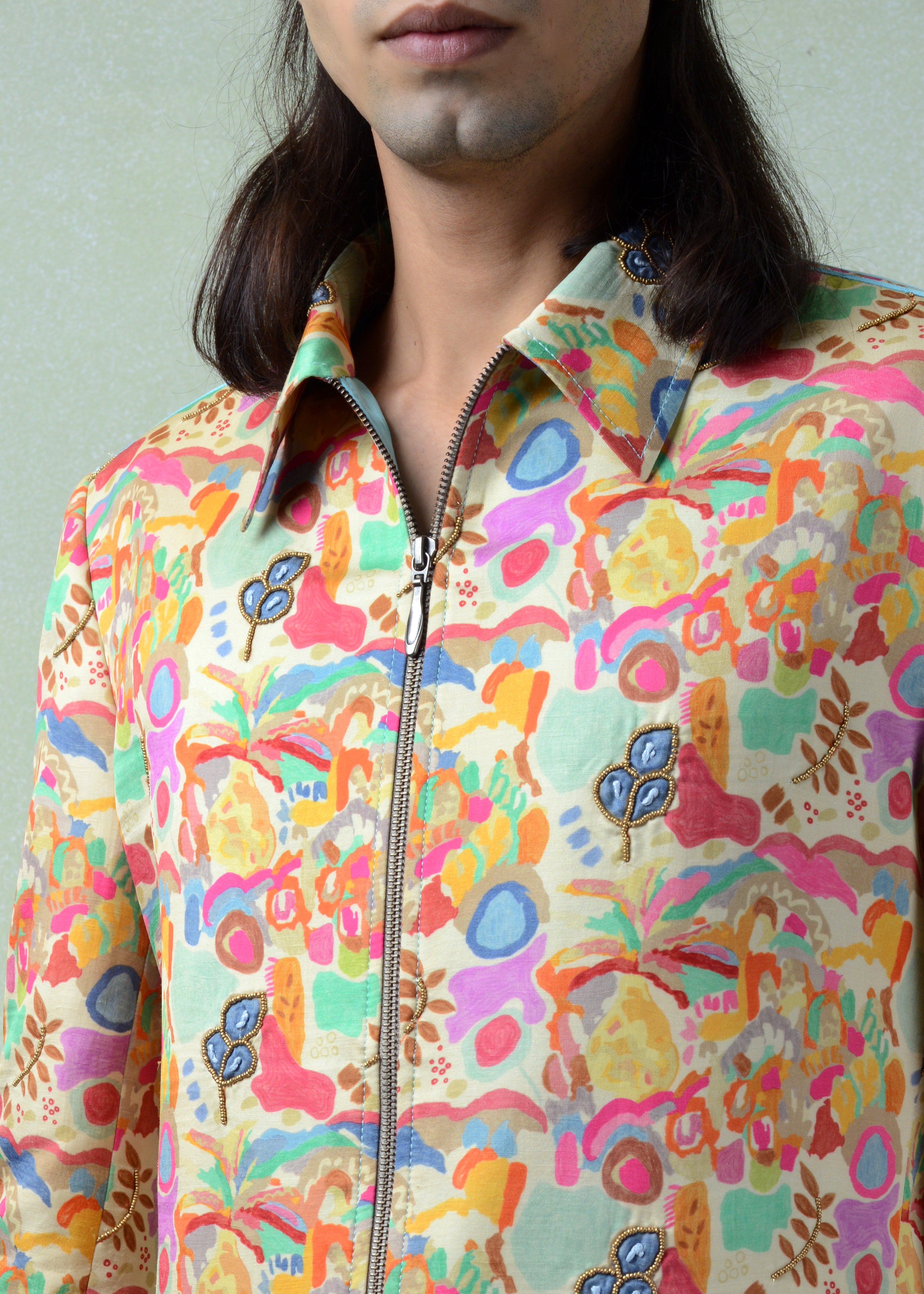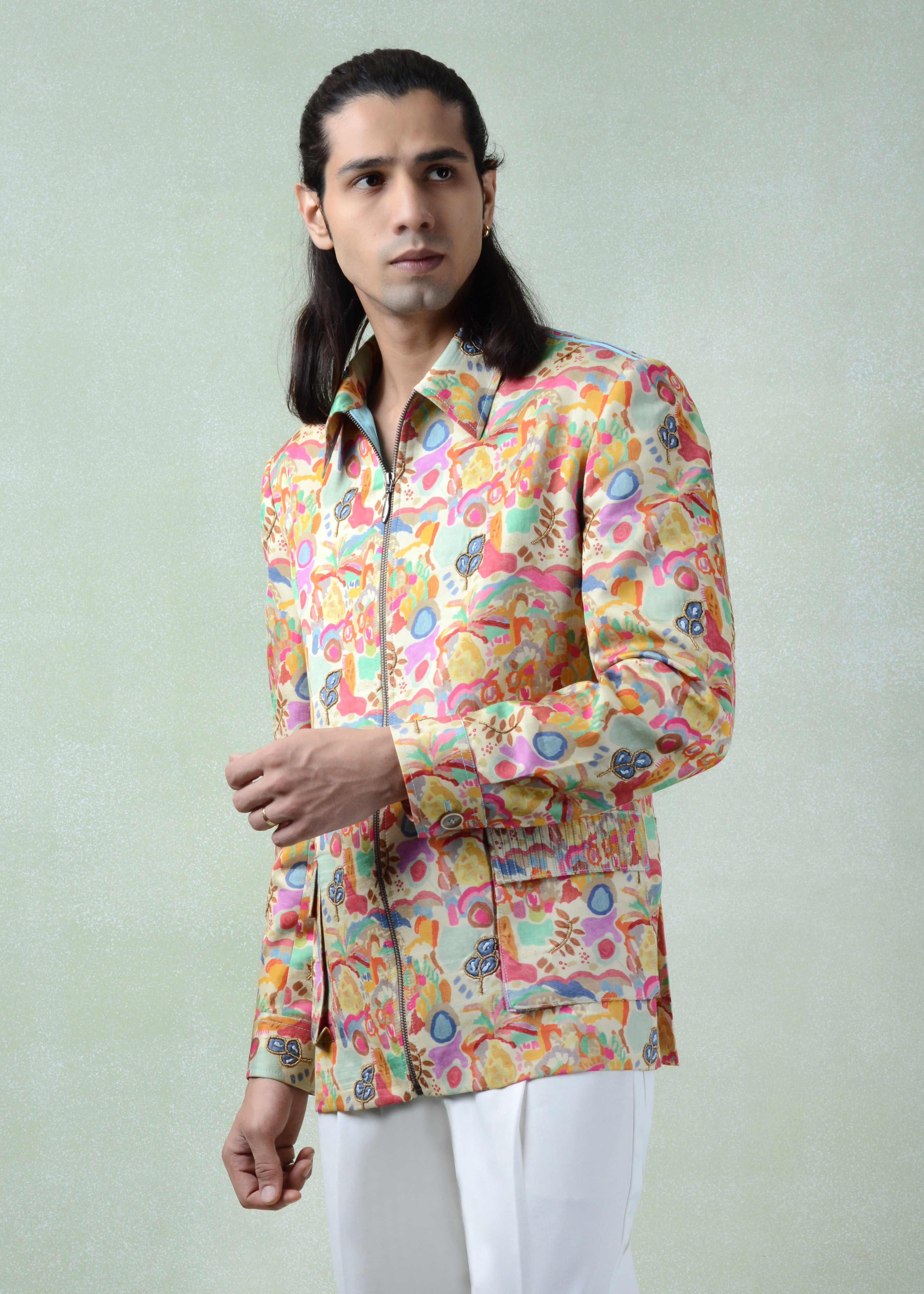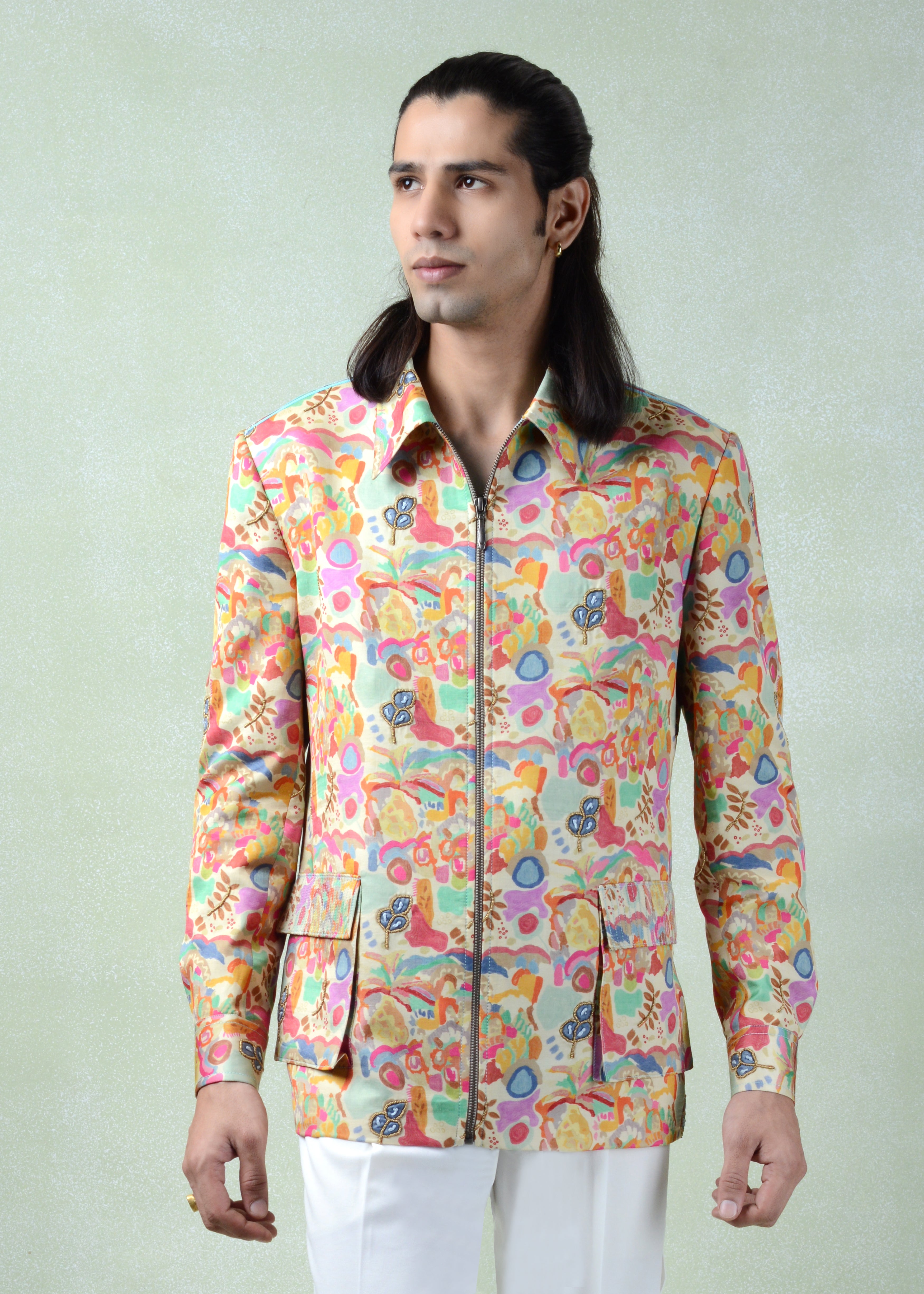 The Casara Shacket is crafted in silk, featuring a multicolour print on a soft beige base with a structured collar, full sleeves, front zip closure, and functional pockets, finished with subtle beadwork for an elevated statement look.